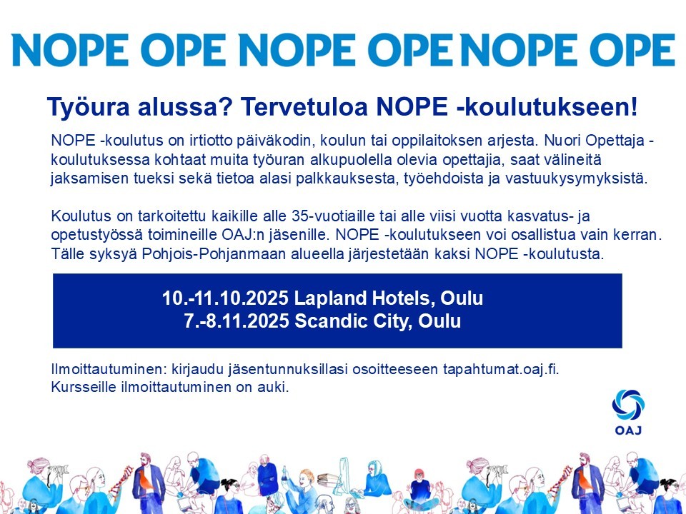 Koulutus on tarkoitettu kaikille alle 35-vuotiaille tai alle viisi vuotta kasvatus- ja opetustyössä toimineille OAJ:n jäsenille. NOPE -koulutukseen voi osallistua vain kerran. Tälle syksyä järjestetään kaksi NOPE -koulutusta. › Ilmoittautumiseen