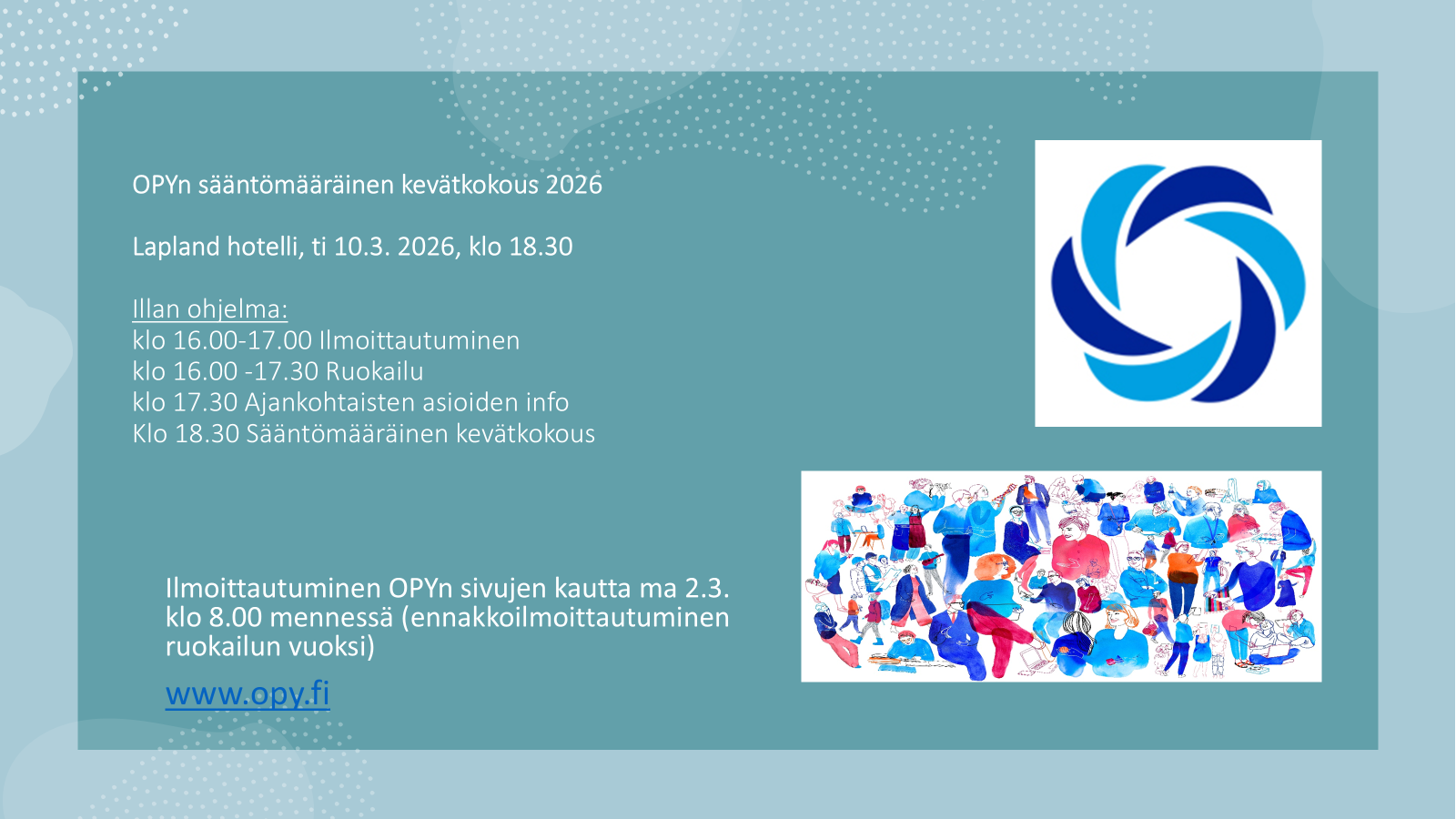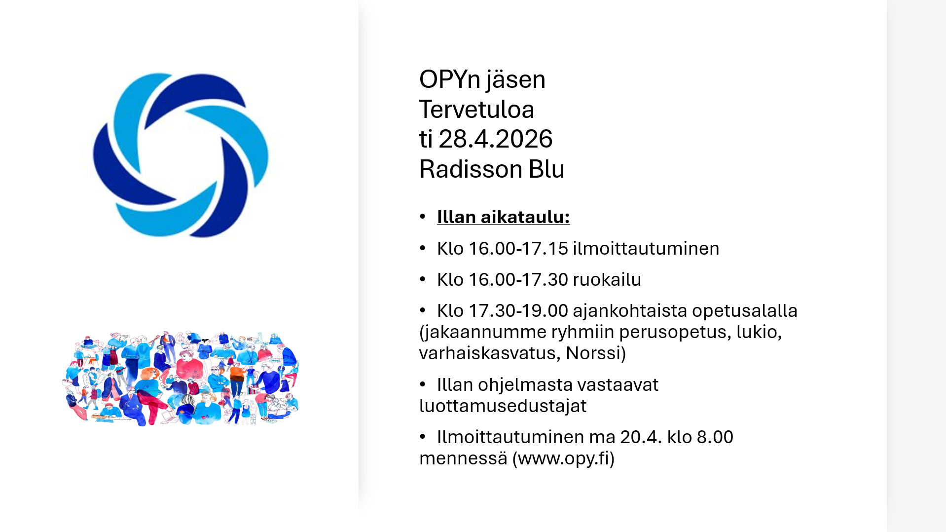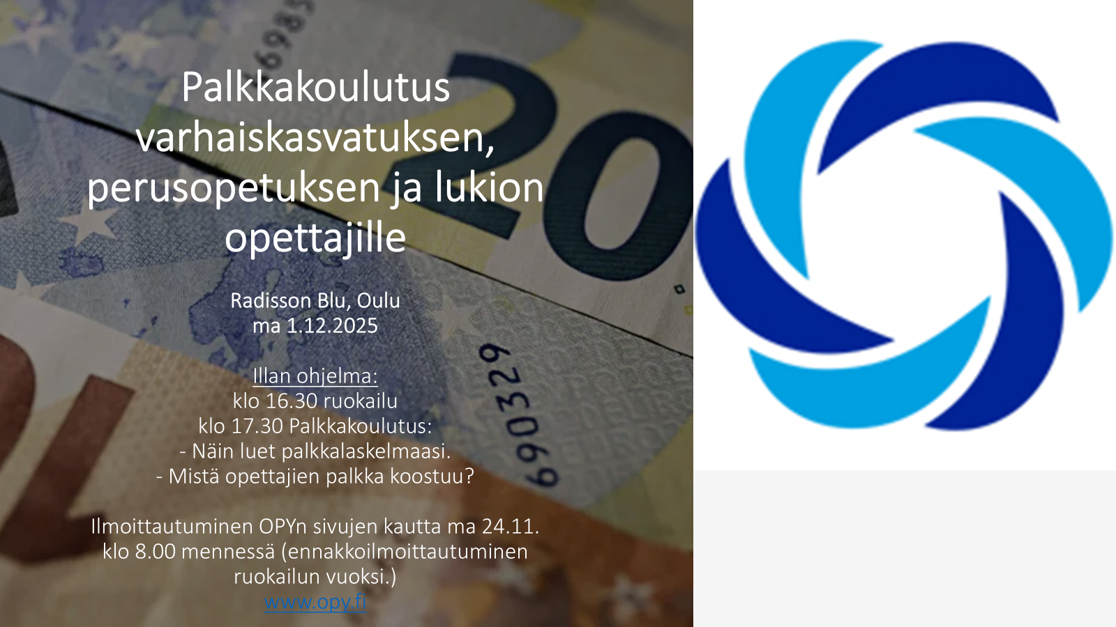 OPY ry on Oulun kaupungin alueella toimiva yhdistys, joka hoitaa jäsentensä edunvalvontaan kuuluvia tehtäviä, tarjoaa mahdollisuuksia jäsenten keskinäiseen yhteistoimintaan ja virkistykseen. Yhdistyksen edustamat opetusalan jäsenet työskentelevät Oulun kaupungin tai Oulun normaalikoulun varhaiskasvatuksessa, peruskouluissa tai lukioissa. Tervetuloa tutustumaan yhdistykseemme!